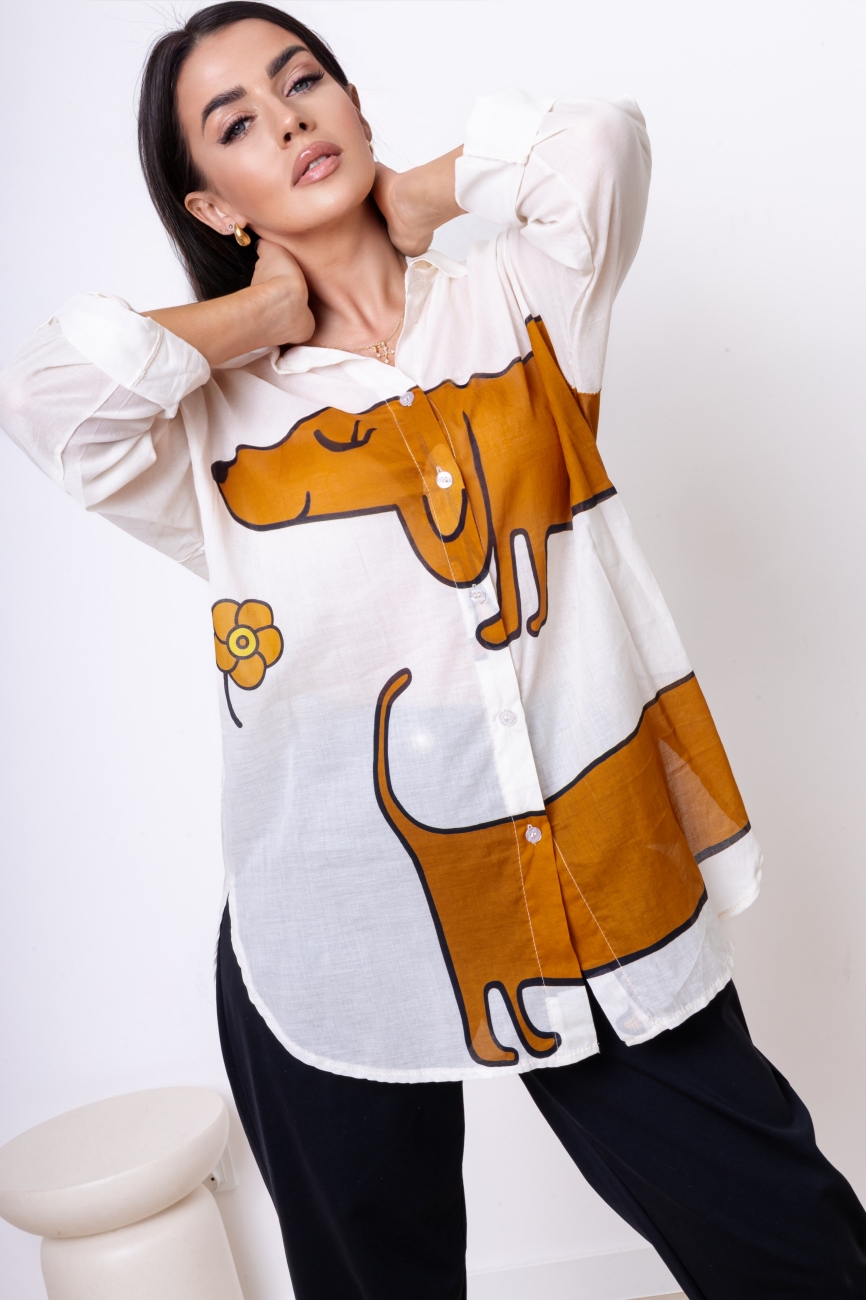 Ta koszula to połączenie komfortu i szyku. Miękki, przyjemny w dotyku materiał otuli Cię delikatnością, a subtelny wzór jamnika doda charakteru każdej stylizacji. Poczuj się wyjątkowo i pewnie siebie, nosząc naszą koszulę "Jamnik".