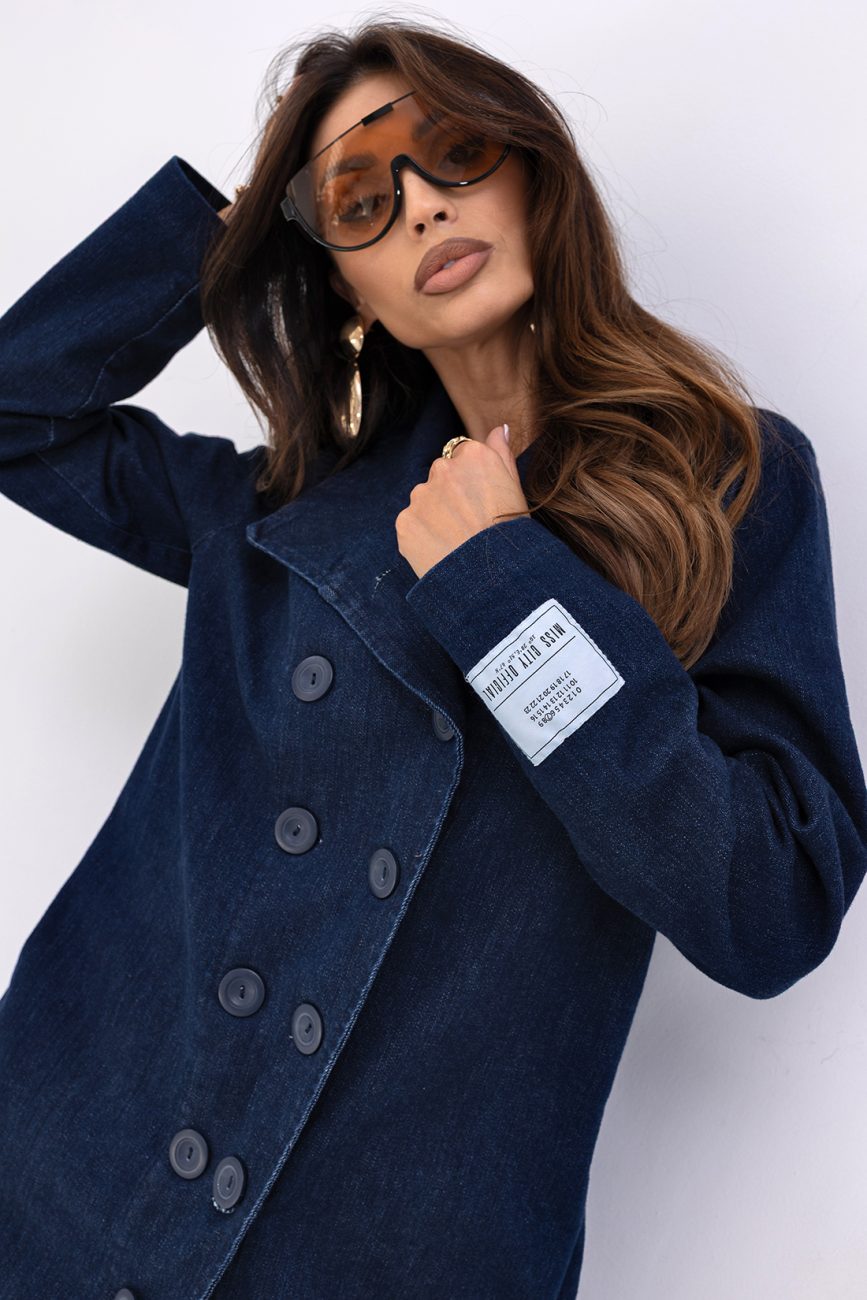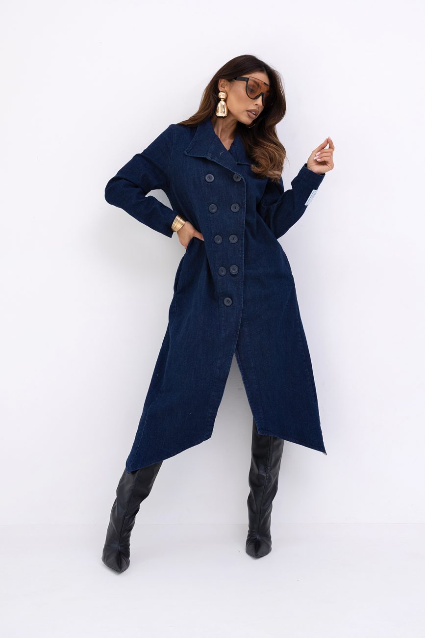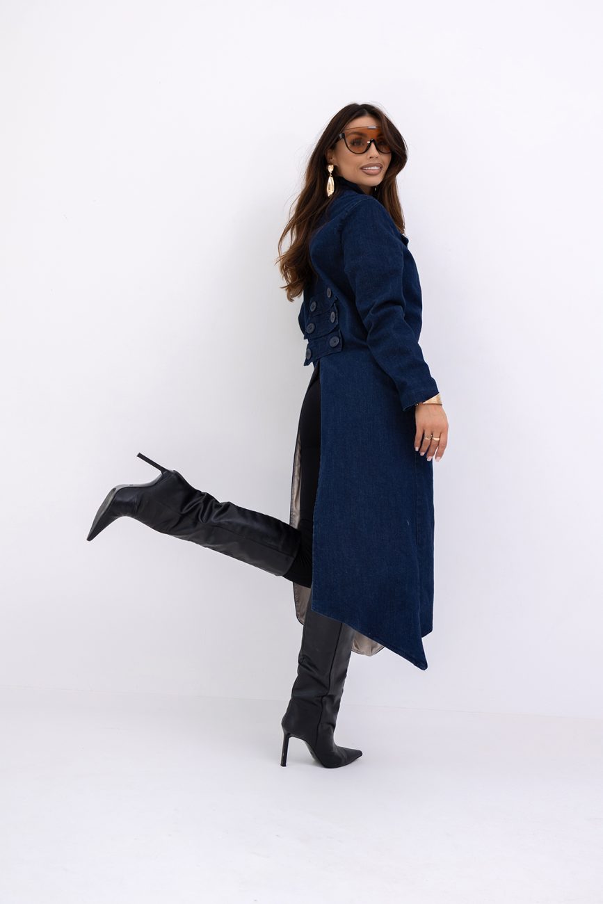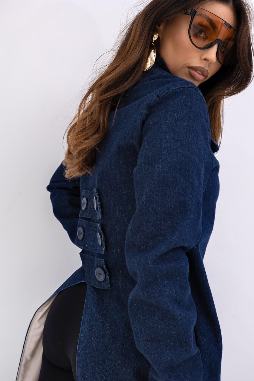 Jeansowy płaszcz do łydek ma wydłużone boki, długi rękaw i jest zapinany na guziki. Z tyłu posiada guziki i głębokie rozcięcie, co zapewnia wygodę i swobodę ruchów. Idealny do casualowych stylizacji, łącząc elegancję z luzem.