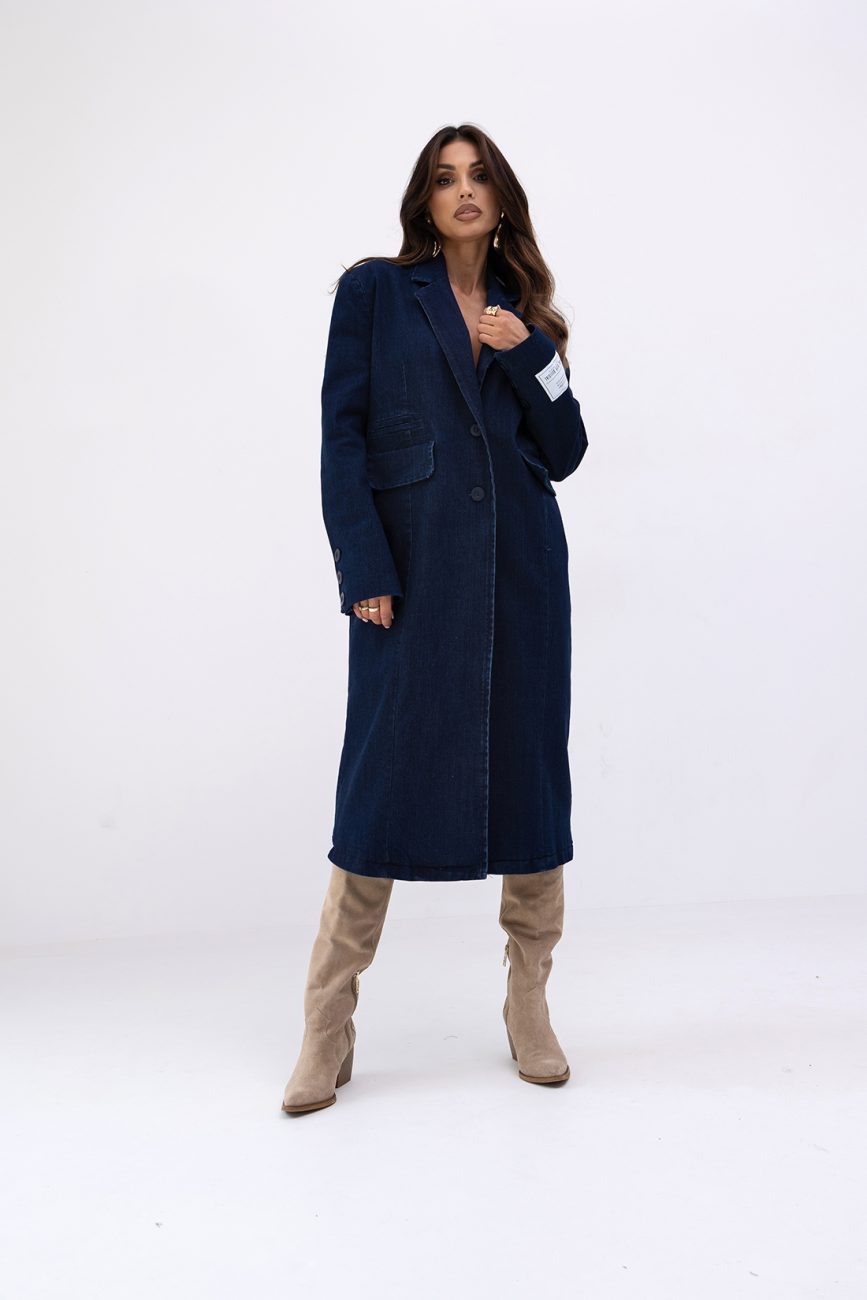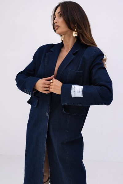 Płaszcz jeansowy premium ma długość sięgającą do łydek, z klasycznymi guzikami z przodu. Wykonany z wysokiej jakości materiałów, oferuje elegancki, ale luźny wygląd. Długi rękaw i brak rozcięcia z tyłu nadają mu pełną, jednolitą formę, co sprawia, że jest stylowy i ponadczasowy. Idealny do eleganckich, codziennych stylizacji, łącząc klasykę z nowoczesnym, casualowym charakterem.
