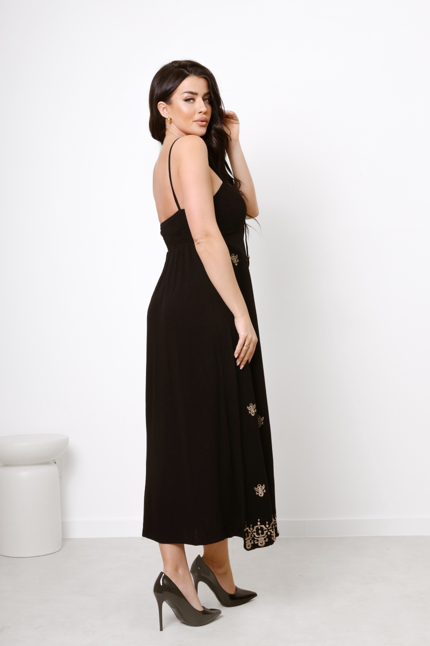 Daj się oczarować subtelnej elegancji sukienki na ramiączkach, zdobionej kunsztownymi haftami. Idealna na letnie wieczory i wyjątkowe okazje, doda Ci niepowtarzalnego uroku.
