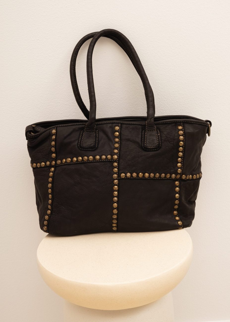 Elementy metalowe w kolorze złotaTorba posiada podszewkę z przegrodą na zamek oraz kieszonki.
