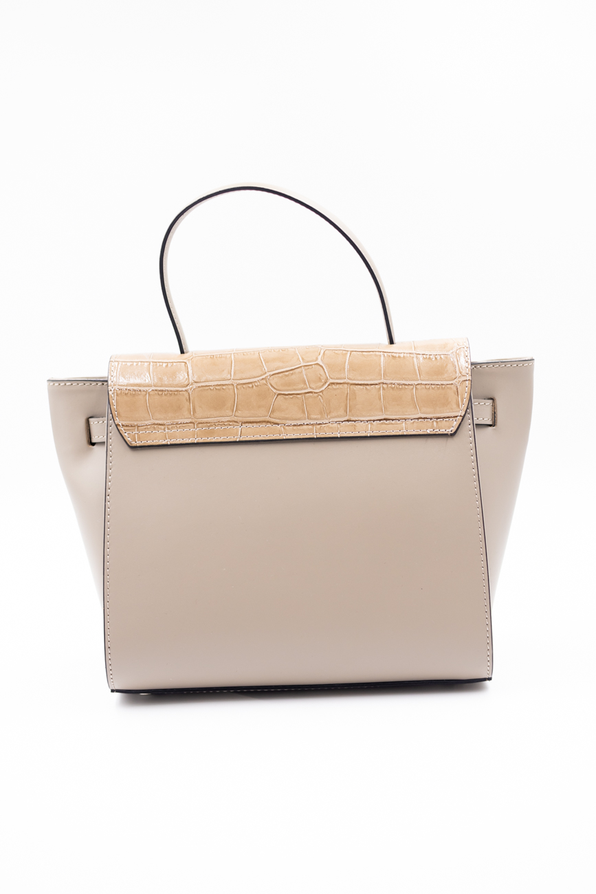 Elementy metalowe w kolorze złotaTorba posiada podszewkę z przegrodą na zamek oraz kieszonki.